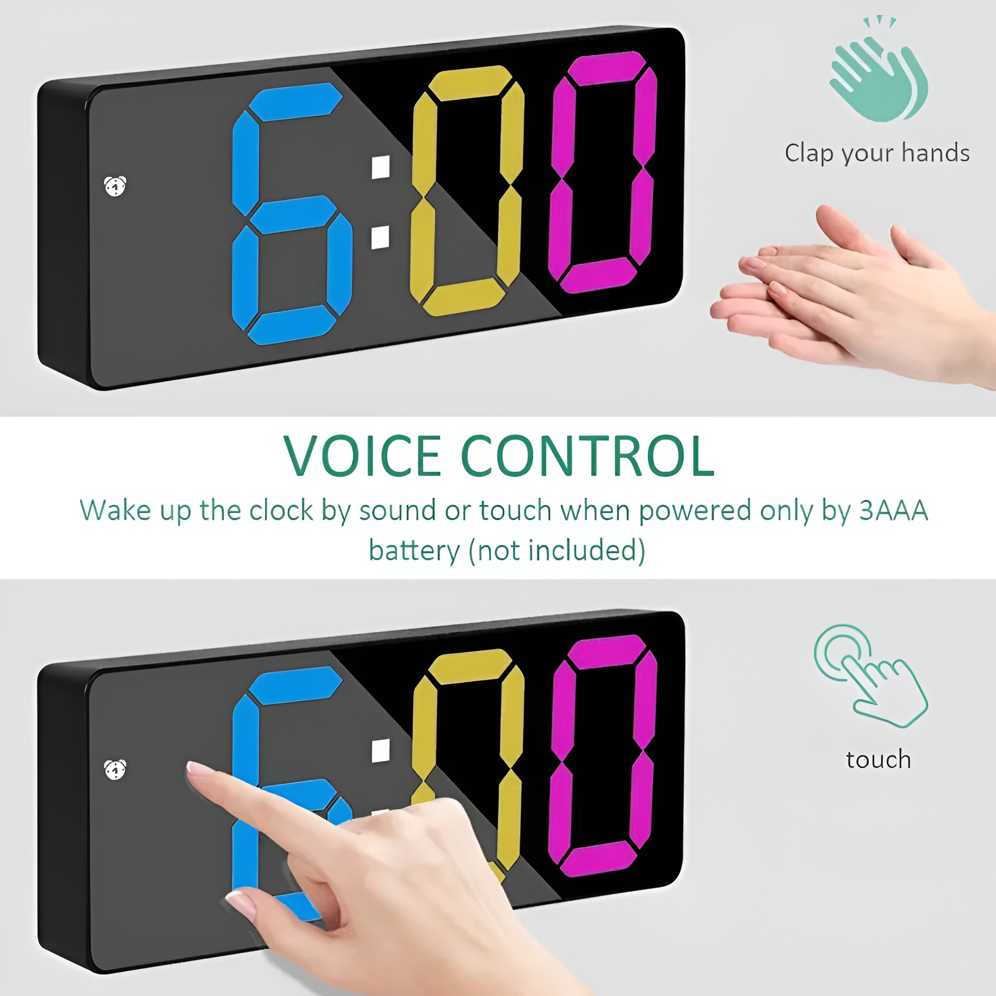 The Voice Control Clock feature activates when running on battery power. A sound such as a clap or desk tap turns on the display. This allows quick time checks without pressing buttons. After a short period of inactivity, the screen turns off to conserve battery life.
